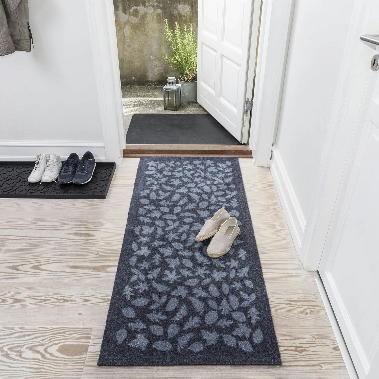 Leaf is a stylish and practical doormat with a frame that collects dirt, gravel, and fluid so the floor does not get dirty. Size S holds a pair of adult shoes, M holds two pairs and L holds four pairs of adult shoes.
